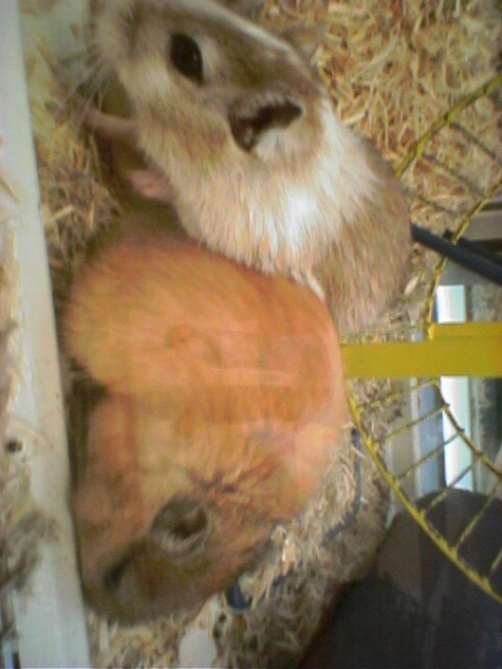 Small brown rodents, kept as pets, poke at the corner of their glass cage.