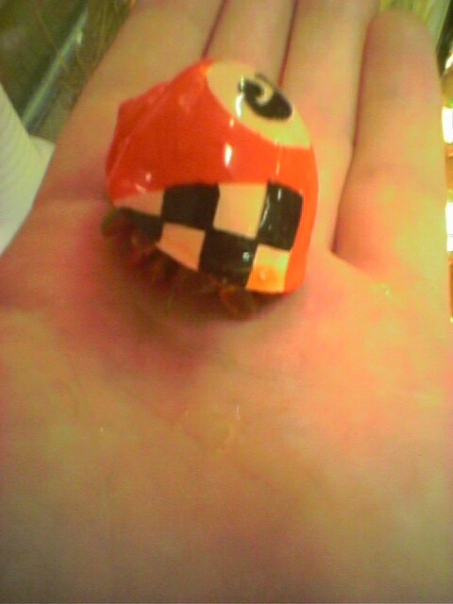 This shows hermit crap with a shell painted like a race car, red with a number 5 and black and white checks, in the palm of someone's hand.