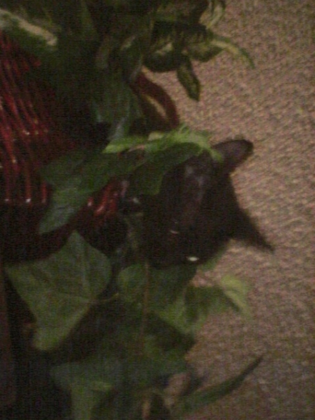Black cat on a tan carpet laying under a plant in a dark brown basket.