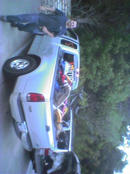Man walking toward the camera, next to silver truck with various items in the bed.