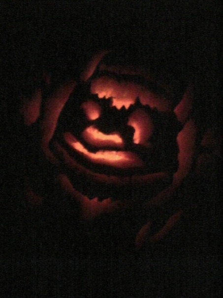 There is a scary face that is carved into a pumpkin that has a candle in it.