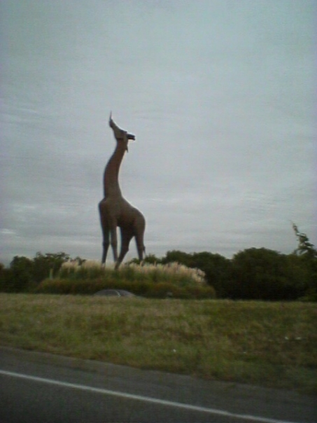 A car passes a large statue of a giraffe which is surrounded by tall grasses with light brown tufts.