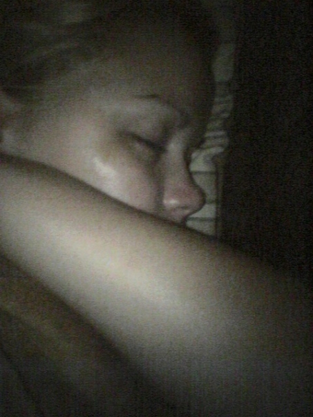 There is a blonde young lady who is sleeping on top of a pillow that has brown stripes.