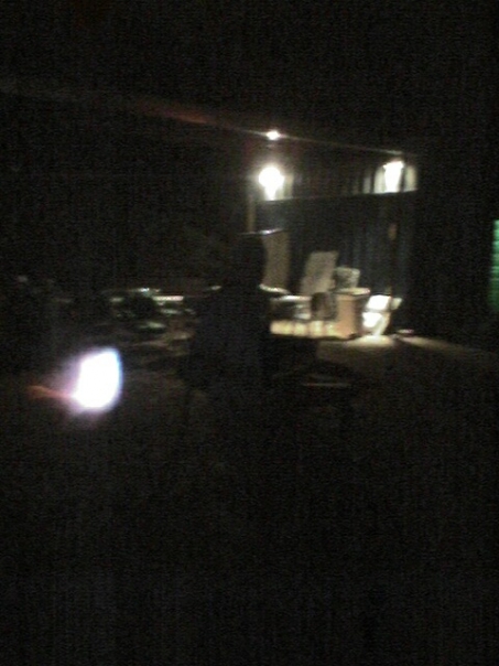 A very dark and blurry photo of a person standing outside of a metal building surrounded by construction supplies.