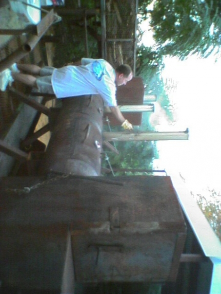 A middle aged man is fixing some type of wood apparatus which looks like a large grill.