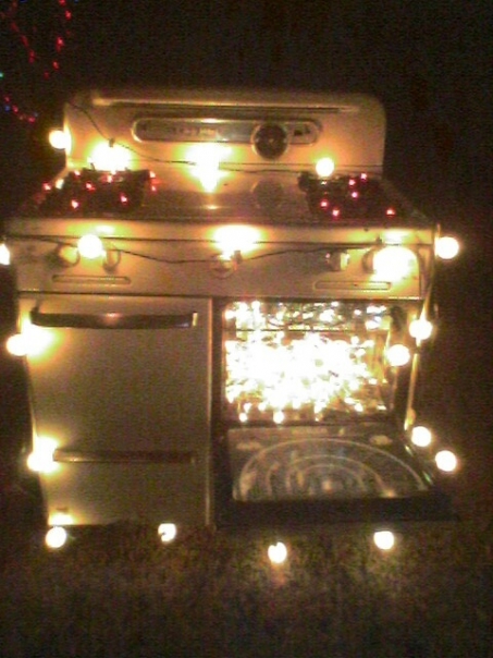 Strings of Christmas lights transform this oven into a seasonal decoration.