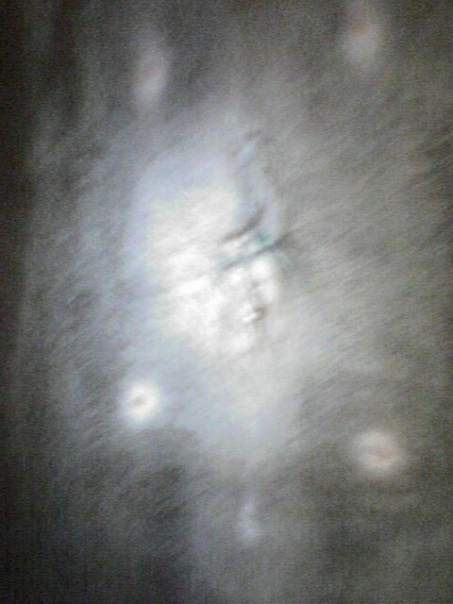 a scary blurry picture of some sort of gray creature with two light eyes.