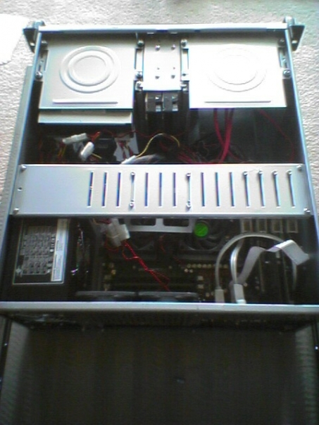 The inside of a desktop computer tower is shown from the top down, exposing its inner components.