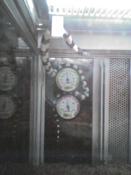 A more than 6 foot long black and white king snake wraps around the pressure gauges.
