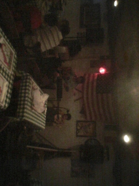 A slightly blurry sideways picture of what looks to be a basement or bar area where musicians are playing/singing a song.