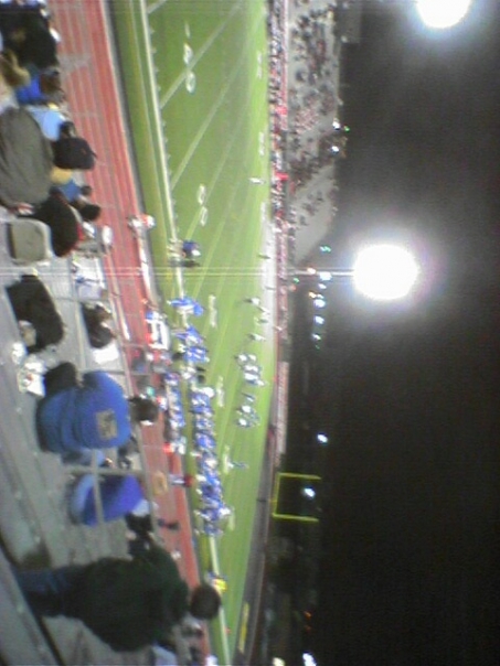 Spectators cheer on the teams that they are rooting for during this nighttime football game.