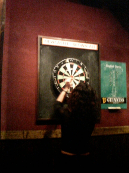 a woman with dark hair pulls darts off of a dartboard.