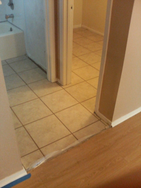 A nice cleaned white tiled floor with tape on the edge of it inside of a bathroom.