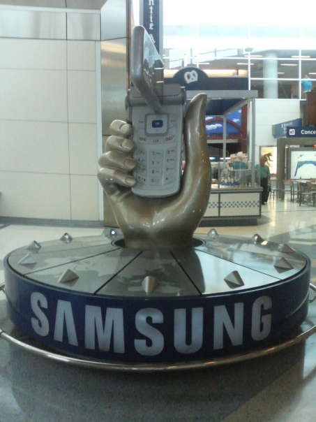 A statute of a hand holding a cell phone with Samsung building in the back ground