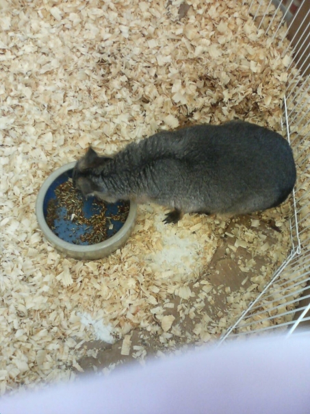 A dark gray animal in a white cage with light-colored wood chips placed on the floor eats from a gray bowl filled with brown pellets.