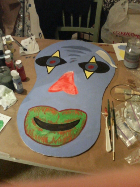 Construction paper design of a cartoon face sitting on top of a work table.
