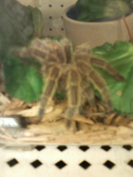 A large, hairy, brown and black tarantula sits on a leaf of lettuce in a glass enclosure.