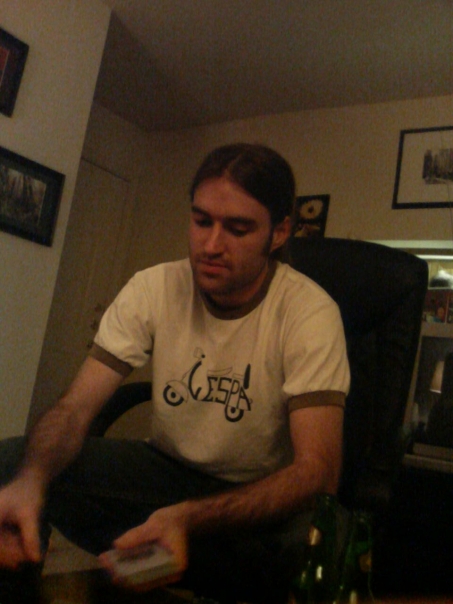 Sitting at home, getting ready to deal a hand in the next round of a card game.