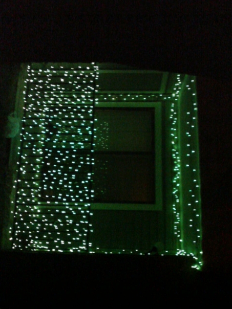 outside picture of window framed by green mini lights casting glow onto a double window in the dark.