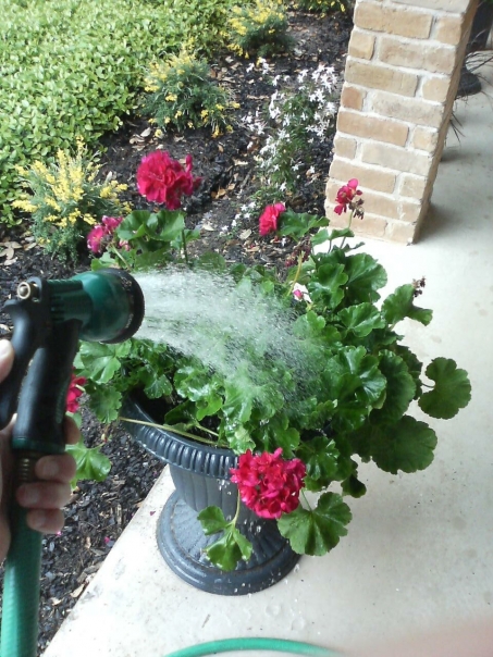 THE RED GERANIUMS ARE WELCOMING A REFRESHING THIRST QUENCHER.
