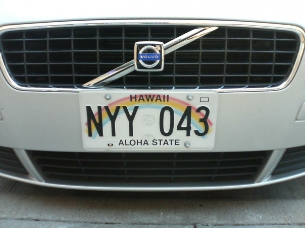 A grey Volvo front grill and the Hawaii number plate, flipped 90 degrees clockwise