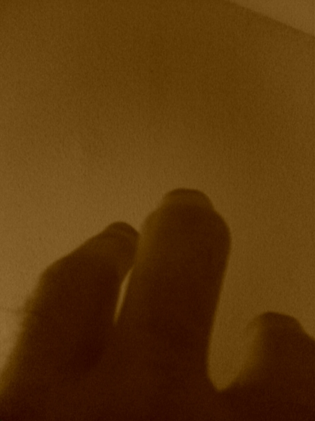 Out of focus picture of three fingers of a right hand against a yellow wall.