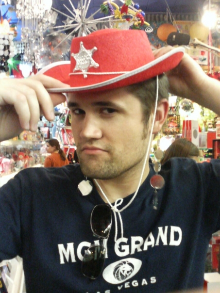A young man wearing an MGM Grand t-shirt is modeling a childrens red cowboy hat with a plastic shiny sheriff's badge in the center.