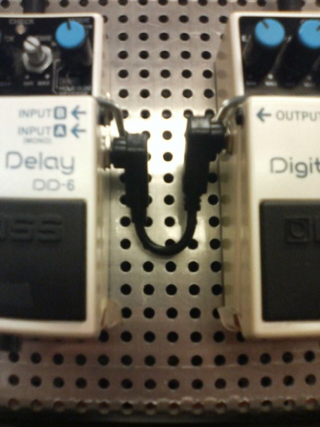 A short black wire connects two modules of an electrical system. The two components sit on a metallic surface covered with holes. Electrical system seems antiquated by today's standards.