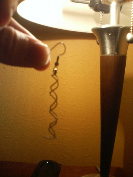 A person holds a long thin earring under a dim light.