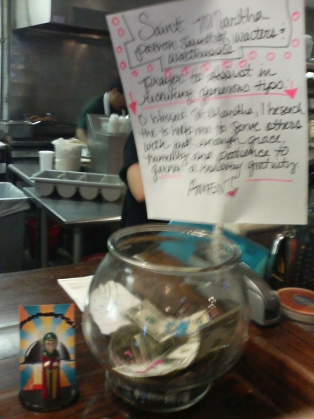 This is a picture of a sign at a restaurants with a tip container.