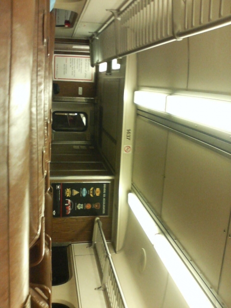 Bright white fluorescent lights are seen over brown leather seats of a train car.