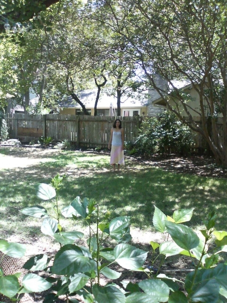 A brunette young woman is standing in her back yard in front of a fence near grass and foliage, and she is wearing a skirt and tank top.