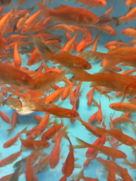 The school of goldfish swam in circles as they tried to get the food that was dropped for them.