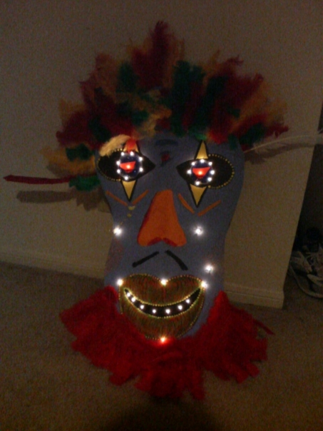 A Tiki mask gets a refreshing addition of festive lights and a holiday red skirt.