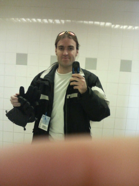 A young man with long brown hair in a ponytail, wearing ski attire, uses the restroom and decides to take a self portrait with his flip cell phone.
