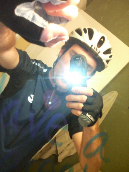 A bicyclist is snapping a picture with the flash on in a mirror that is slightly painted blue.