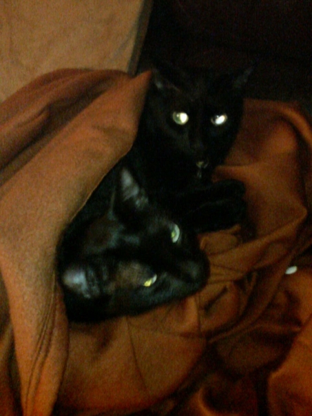 Two beautiful adult black cats with green eyes cuddle together in an orange oversized blanket.