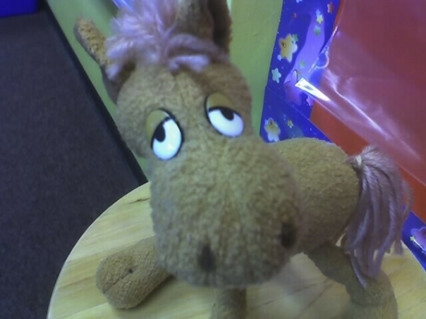 A stuffed horse with dopey eyes and a yarn tail is standing on a wooden circle.