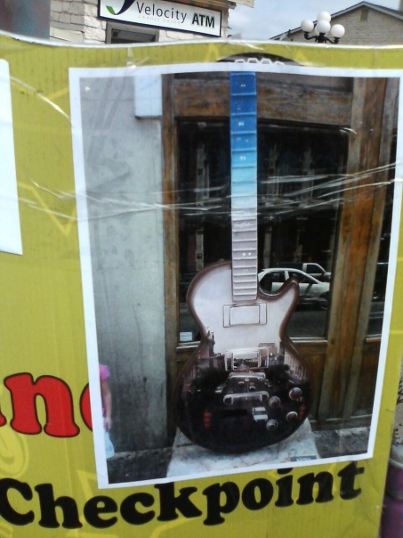 A shiny electric guitar appearing to be displayed outside a display case that says checkpoint in black.
