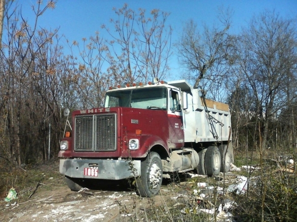 a red truck in the woods the driver is not seen