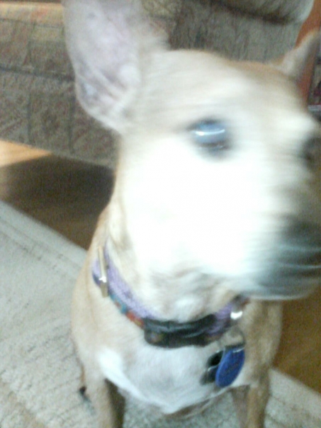 A brown and white dog, a family pet, won't sit still for a clear picture.