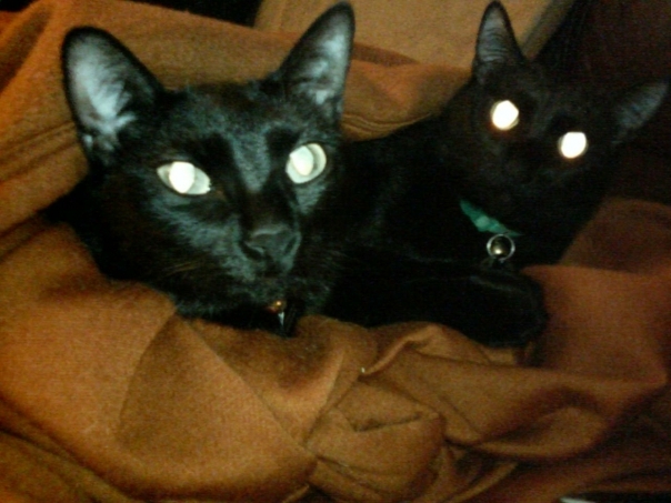 black, cats, ears, eyes, glow, cuddle, two, collars, green, pet, fur, hair, coat, bed,