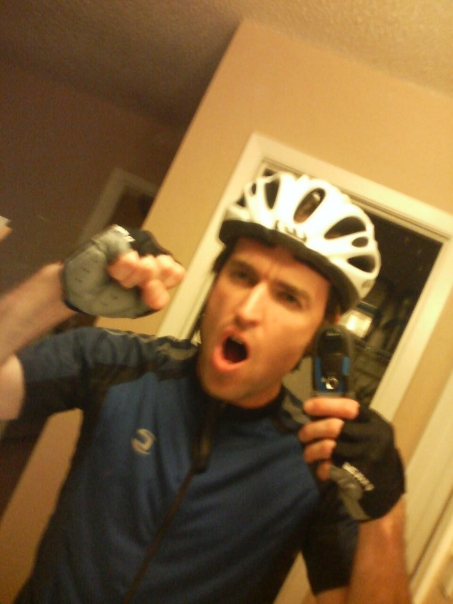 A stoked pumped-up bike messenger taking a quick selfie before a run.