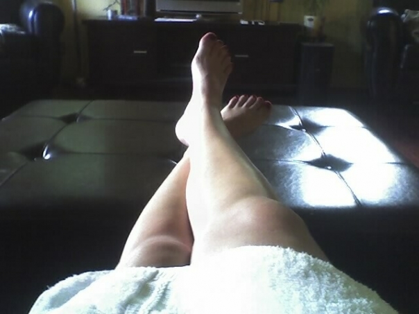 There is a person sitting down and they have their legs resting on a black stool. Their toenails are painted a dark pink.