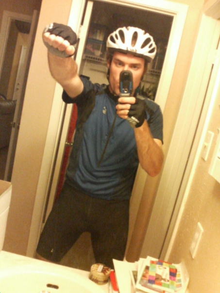 A man decked out in bicycling gear takes a photograph of himself in a bathroom mirror.