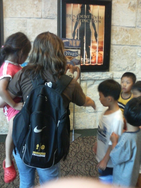 Several people are on a field trip with little kids