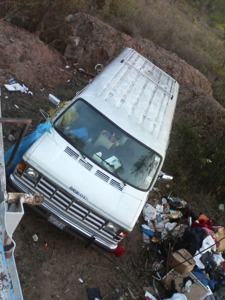 A white van full of trash that is also surrounded by trash.