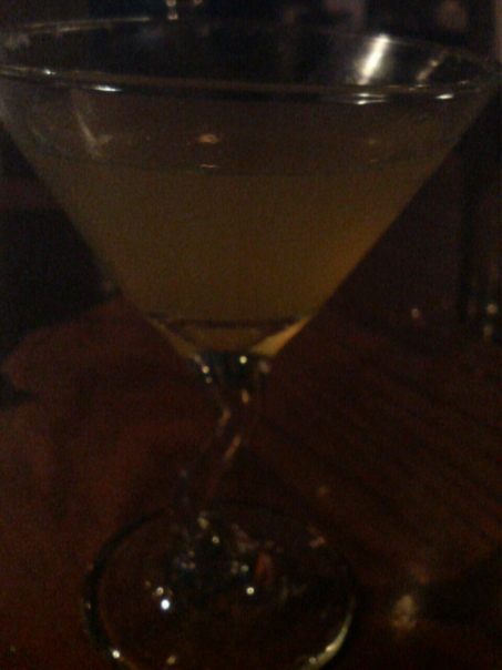 Yellow colour drink into a glass for martini on a brown table