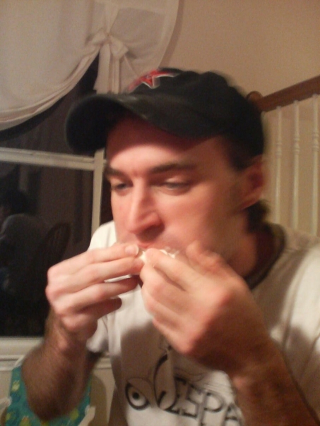 Blurry photo - man in black hat with red star is shoving some sort of delicious food in his mouth
