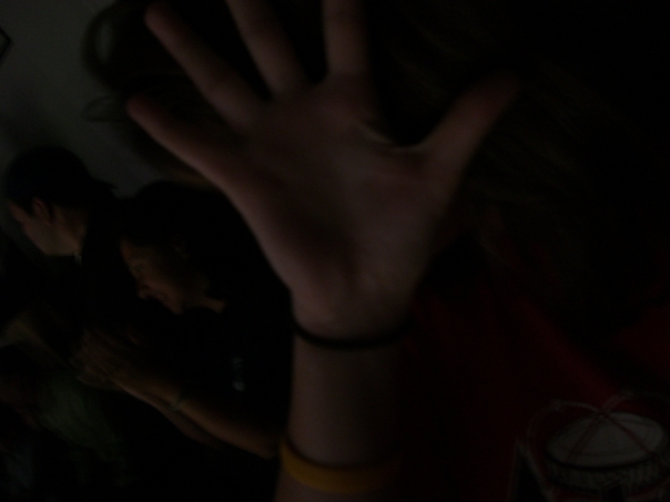 a dark photo of a hand in the foreground with people in the background including a woman taking a picture with a camera